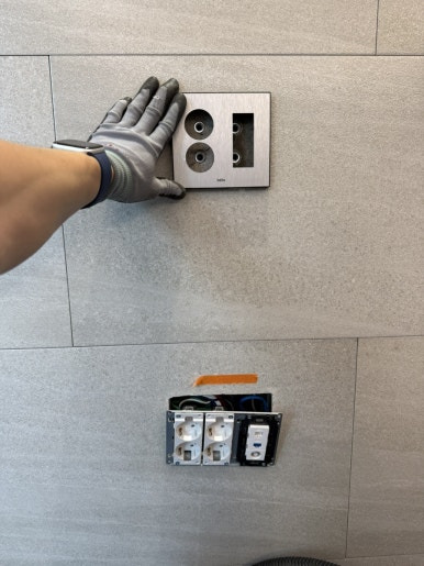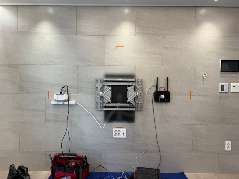 나중에 티비를 철거했을 때 수구 콘센트를 끼워 넣으면 이렇게 중앙이랑 하단에 콘센트가 생기고 다른 아트월에는 손상이 없이 마감됩니다