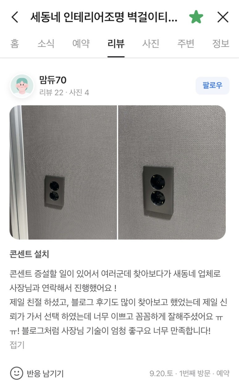 "와 진짜 깔끔하다 사장님 왜 우리 아파트 입주시기때 안오셨어요? 다른집 설치한 거 보니까 천장부터 선 노출로 된 집도 있고 콘센트 높이가 허리춤에 오는 집도 있고 제가 본 콘센트 증설사진중 제일 깔끔하고 이쁜 거 같아요"